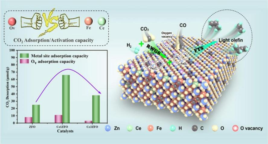 该研究工作开发了一种铈掺杂ZnFe2O4尖晶石催化剂(CenZFO),通过氧空位调控与相结构优化,成功解决了CO2制烯烃反应中活化与C—C偶联的平衡难题。Ce3+的引入使氧空位浓度显著提升至29.3%,增强了CO2吸附并抑制甲烷生成。最优催化剂在290 ℃、2 MPa条件下实现38.1%的CO2转化率和46.5%的低碳烯烃选择性。研究表明Ce掺杂促进Fe3O4向Fe5C2转化,降低反应能垒,并稳定关键活性相。催化剂展现70小时稳定运行能力,活性衰减低于5%。该工作通过“掺杂-空位-相调控”协同策略,为CO2高效转化提供了新途径。(供稿/环境工程系 编辑校对/耿忠武 审核/王毅红 钱育林)