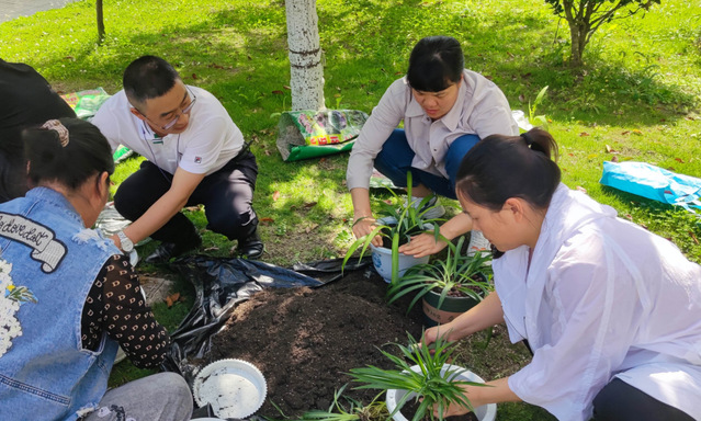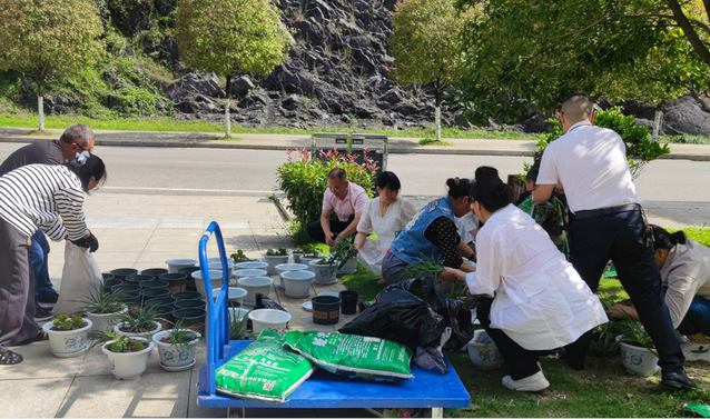 活动中,图书馆干部、职工顶着炎炎烈日栽种绿植。有人捡拾碎石铺垫花盆底部,有人抓土入盆栽种,有人提水浇灌绿植定根,有人搬运入库摆放……既有序分工又团结协作,场面热火朝天不亦乐乎!